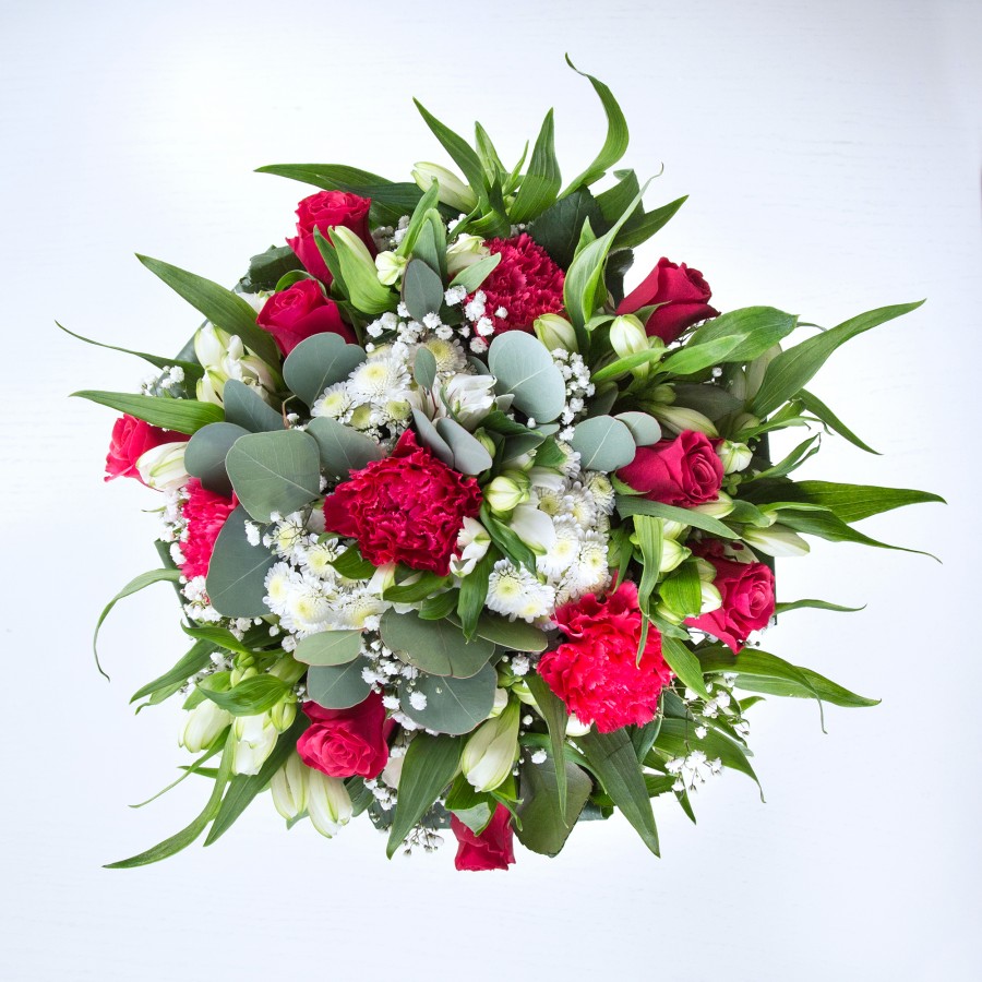 Our Radiant Beauty Bouquet is a masterpiece of color and design. Featuring sweet white chrysanthemums and gypsophila, paired with striking red roses and cheerful carnations, all artistically arranged with white alstroemeria and aspidistra leaves.